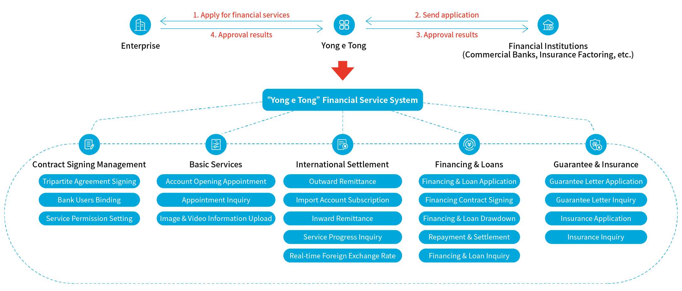 Kunpay aggregates numerous financial institution channels to provide secure, convenient, and efficient cross-border remittance services, financing and loan services, one-stop letter of guarantee services, and online account opening services to corporate customers on the "Yong e Tong" platform in Ningbo Port. Ningbo Port is the second largest port in China and the third largest globally, covering over 200,000 import-export enterprises with an annual import-export value of RMB 3 trillion.